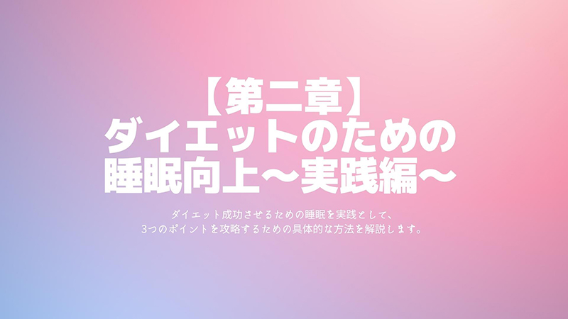 このセッションでは、食事と運動に加え、体を休息させる睡眠の向上を目指していきます。 この段階から、さらに3つ目の要素か加わり、 さらなるダイエットアプローチの相乗効果の強化をしていきます。